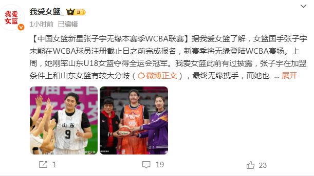 北京时间11月19日,根据媒体人我爱女篮报道,中国女篮国手张子宇未能在WCBA球员注册截止日之前完成报名,她将无缘新赛季的WCBA赛事。张子宇虽然上周率领山东U18女篮在全运会夺冠,但她与山东女篮存在较大分歧导致尚未能够完成签约。